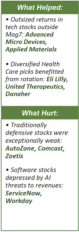 The rotation into the health care sector was broad and the portfolio was well positioned in various industries. Biopharma Eli Lilly, biotech stocks Incyte and United Therapeutics, and life sciences giant Danaher all contributed positively to strong Q4 performance. Gains in chip related stocks also helped the portfolio. As doubts about the circularity of AI revenue deals began to surface, stocks such as Advanced Micro Devices, Broadcom, and Applied Materials avoided the negative sentiment that plagued other AI/chip stocks connected to OpenAI related deals.