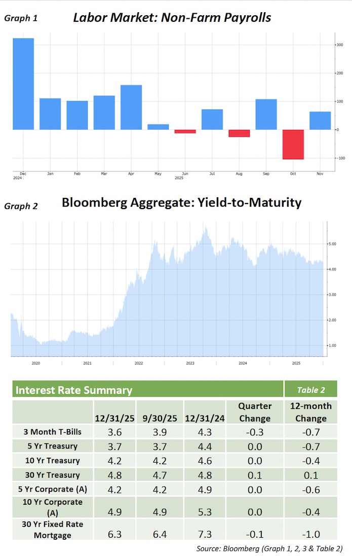 Despite a very good year of performance, yields are still at a very attractive point (Graph 2) and there are catalysts that remain to provide further gains. Given the weakness in the labor market and many uncertainties heading into 2026, a strong case can be made for focusing on high-quality assets and for investment grade fixed income to present a solid risk/reward return scenario.