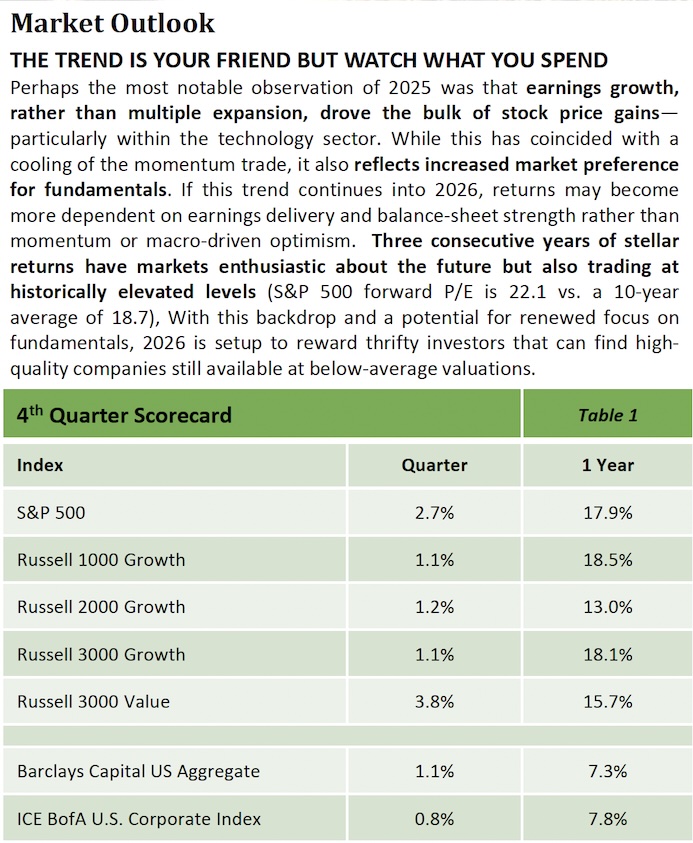 Perhaps the most notable observation of 2025 was that earnings growth, rather than multiple expansion, drove the bulk of stock price gains—particularly within the technology sector. While this has coincided with a cooling of the momentum trade, it also reflects increased market preference for fundamentals. If this trend continues into 2026, returns may become more dependent on earnings delivery and balance-sheet strength rather than momentum or macro-driven optimism. Three consecutive years of stellar returns have markets enthusiastic about the future but also trading at historically elevated levels (S&P 500 forward P/E is 22.1 vs. a 10-year average of 18.7), With this backdrop and a potential for renewed focus on fundamentals, 2026 is setup to reward thrifty investors that can find high-quality companies still available at below-average valuations.
